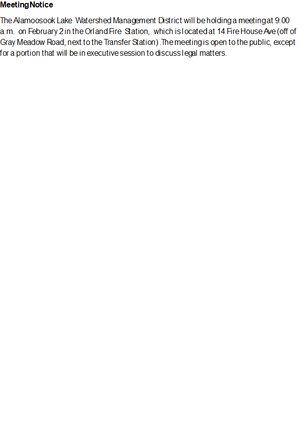 The Alamoosook Lake Watershed Management District will be holding a meeting at 9:00 a.m. on February 2 in the Orland Fire Station, which is located at 14 Fire House Ave (off of Gray Meadow Road, next to the Transfer Station) .The meeting is open to the public, except for a portion that will be in executive session to discuss legal matters.