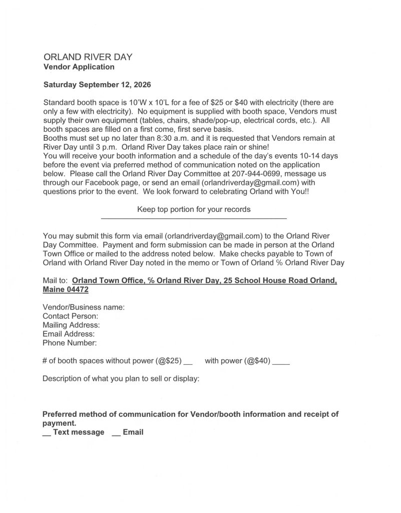 It’s that time of year again! Time to start planning and looking forward to Orland River Day 2026! We had such a fantastic turn out last year and hope to see everyone back for this years event. There will be events taking place along Narramissic Drive and up to the Orland Community Center. We are always looking for vendors and food trucks to take part in the festival. Any questions or if you would like to be a vendor please contact the Town Office at 207-469-3186 or the Orland River Day Committee at [email protected]