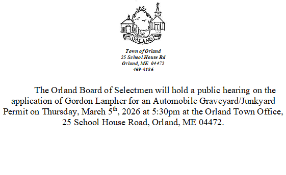 The Orland Board of Selectmen will hold a public hearing on the application of Gordon Lanpher for an Automobile Graveyard/Junkyard Permit on Thursday, March 5th, 2026 at 5:30pm at the Orland Town Office, 25 School House Road, Orland, ME 04472.
