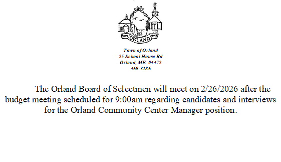 The Orland Board of Selectmen will meet on 2/26/2026 after the budget meeting scheduled for 9:00am regarding candidates and interviews for the Orland Community Center Manager position.