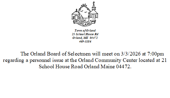 The Orland Board of Selectmen will meet on 3/3/2026 at 7:00pm regarding a personnel issue at the Orland Community Center located at 21 School House Road Orland Maine 04472.