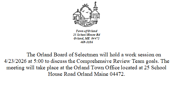 The Orland Board of Selectmen will hold a work session on 4/23/2026 at 5:00 to discuss the Comprehensive Review Team goals. The meeting will take place at the Orland Town Office located at 25 School House Road Orland Maine 04472.