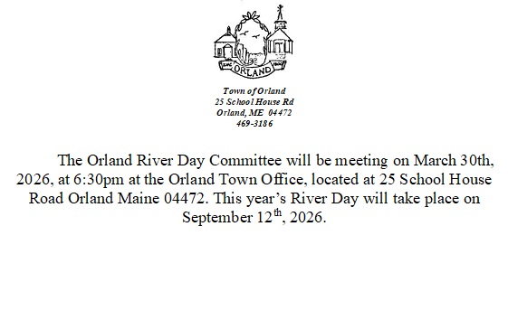 The Orland River Day Committee will be meeting on March 30th, 2026, at 6:30pm at the Orland Town Office, located at 25 School House Road Orland Maine 04472. This year’s River Day will take place on September 12th, 2026.