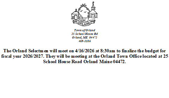 Budget Meeting 4/16/2026: The Orland Selectmen will meet on 4/16/2026 at 8:30am to finalize the budget for fiscal year 2026/2027. They will be meeting at the Orland Town Office located at 25 School House Road Orland Maine 04472.