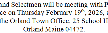 The Selectmen for the Town of Orland will hold a special Selectmen’s Meeting on Tuesday February 3rd, 2026 at 9:00am.… Read More
